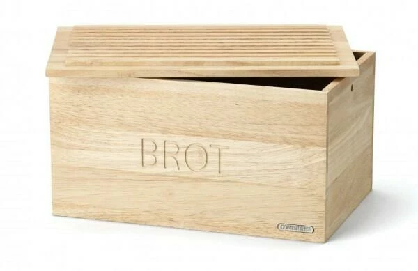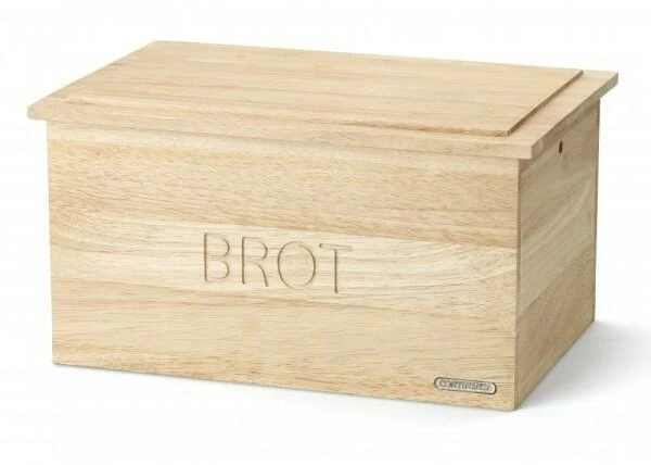 Der Continenta-Brotkasten lässt sich aufgrund seiner Form gut verstauen. Zudem kann die Oberseite als Schneidebrett benutzt werden. In das Holz ist das Wort Brot eingefräst.