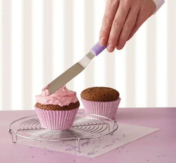 Kleine Palette zum Verzieren und Dekorieren von Gebäck oder Gerichten. Mit 10 cm Länge und Kunststoffgriff. Die Breite der Palette beträgt 21 mm.
