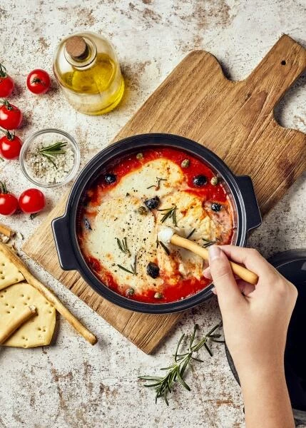 Ob Brie, Mozzarella oder Ziegenkäse: Legen Sie einfach den Käse in den Baker, fügen Sie süße oder herzhafte Beilage hinzu, schließen Sie den Deckel und stellen Sie ihn in den Ofen. Nach dem Backen direkt darin servieren.