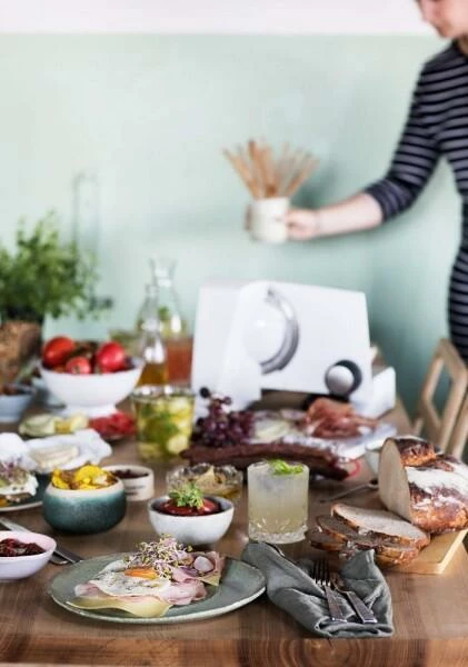 Frisches Essen schmackhaft und nachhaltig zubereiten – das fängt bereits beim Schneiden an. Mit seinem kompakten Design findet der Allesschneider Sliced Kitchen S10001 von Graef in jeder Küche seinen Platz. Er ist dabei sowohl für junge Haushalte, als auch für jeden gedacht, der Wert auf frische, gesunde Ernährung legt. Die Metallmaschine mit rutschfestem Standfuß überzeugt vor allem durch das solide Zusammenspiel aller Komponenten. Der energiesparende Gleichstrommotor Eco Power Motion arbeitet zugleich stark und leise mit 45 Watt und einer Spitzenschneidleistung von 170 Watt. Er lässt ein 170 mm breites, rostfreies Edelstahlmesser mit Wellenschliff rotieren. Zusätzlich ist der Allesschneider mit einem Safety-Verschluss und einer Kindersicherung „Clip“ ausgestattet. Nicht zuletzt glänzt die Maschine durch seine zeitlose Form. Auch die verschiedenen Farben, in denen die SKS 100-Serie erhältlich ist, lassen keinen Designwunsch offen. Zudem kann zwischen zwei Linien gewählt werden, der SKS 100 mit Standfuß und der SKS 110 mit Bodenplatte.