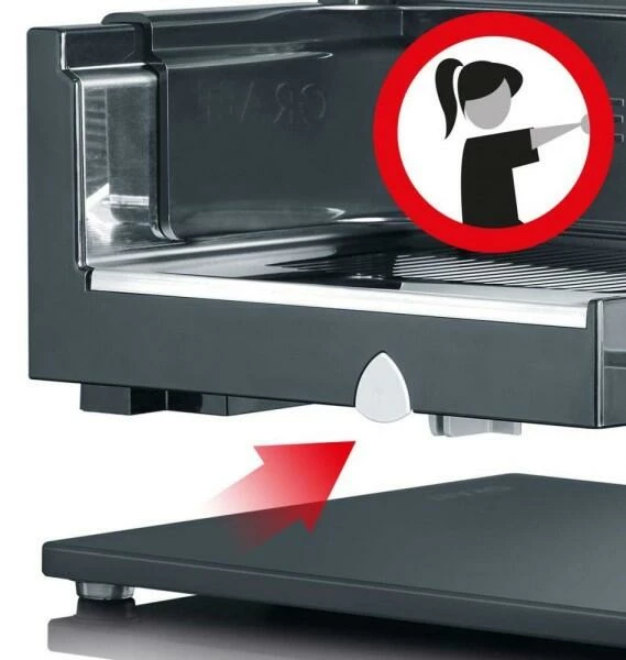 - Stabiler und leichtgängiger Kunststoffschlitten mit Edelstahlauflage und Kindersicherung