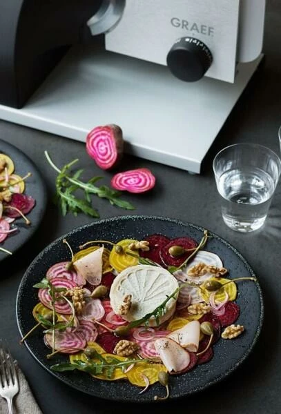 Beim Allesschneider Sliced Kitchen SKS 901 von GRAEF wird das Schnittgut auf einem Aluschlitten aus harteloxiertem Aluminium gegen das rotierende Messer geführt. Ergänzt durch den separat erhältlichen MiniSlice Aufsatz, können auch kleinere Zutaten sicher und komfortabel geschnitten werden: Durch einen Einfüllschacht fallen Gemüse, Obst oder Salami dem Messer einfach mittels Schwerkraft entgegen. Auch kleine Kartoffeln oder Pilze können mit hoher Geschwindigkeit ohne Reste und ohne Verletzungsgefahr in dünne Scheiben geschnitten werden. Durch den dünnen Schnitt kann sich das Aroma der Zutaten intensiver entfalten und verkürzt zusätzlich auch die Garzeit beim Kochen.