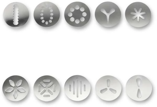 - 10 verschiedene Edelstahlgebäckscheiben für perfekte Konturen