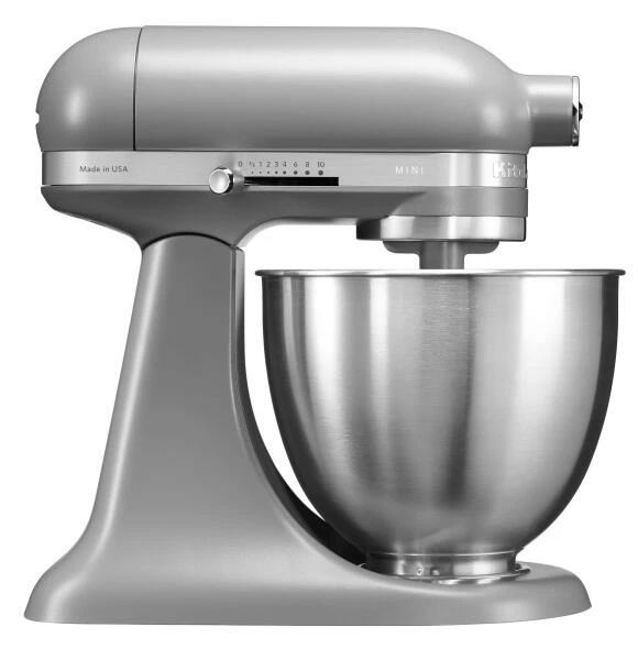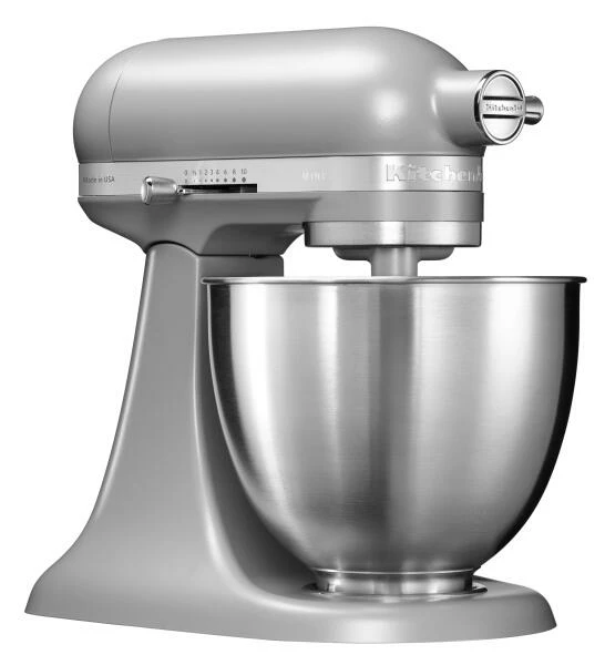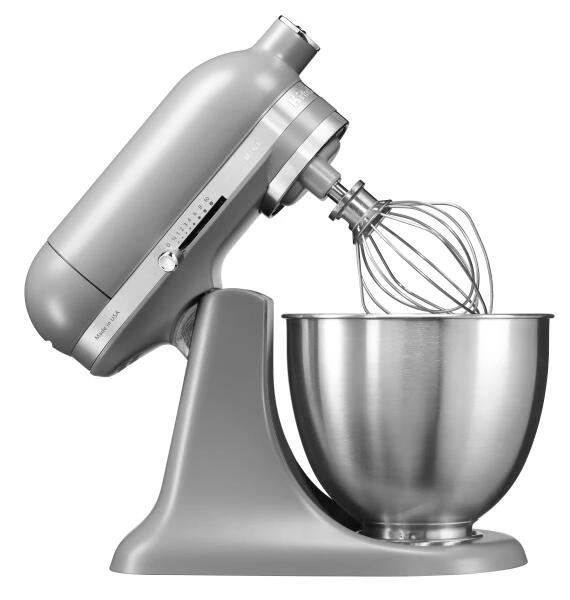 KitchenAid Mini-Küchenmaschine in mattgrau, 3,3 L. DKompakte aber leistungsstarke Küchenmaschine mit klassischem, kippbarem Motorkopf. Die Zubehörnabe ist kompatibel mit den Zubehöraufsätzen der klassischen KitchenAid Küchenmaschine.