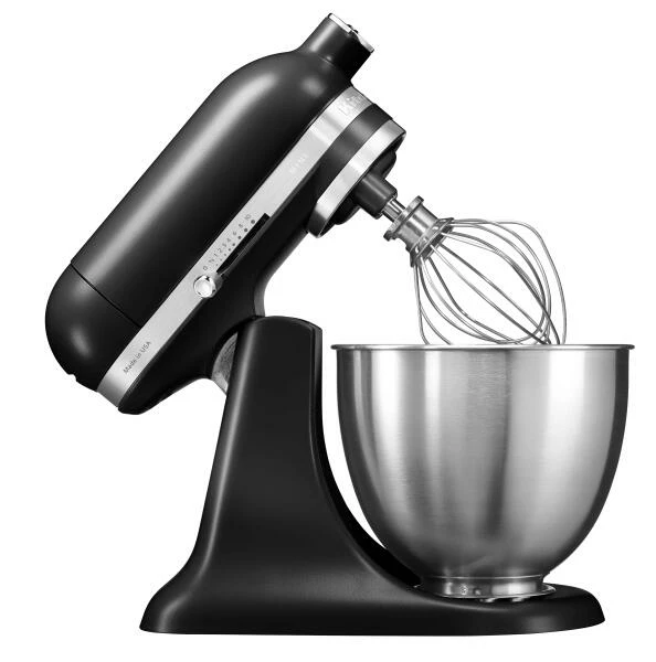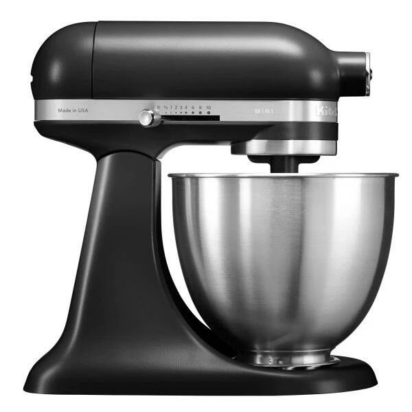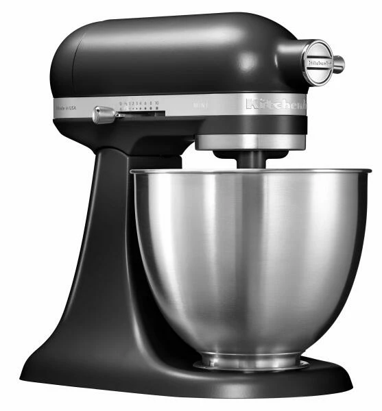 KitchenAid Mini-Küchenmaschine in mattschwarz, 3,3 L. Kompakte aber leistungsstarke Küchenmaschine mit klassischem, kippbarem Motorkopf. Die Zubehörnabe ist kompatibel mit den Zubehöraufsätzen der klassischen KitchenAid Küchenmaschine.