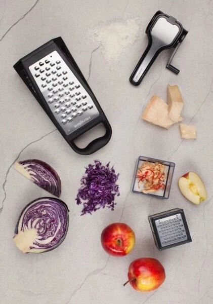Microplane Multireibe Cube in schwarz. Die innovative Reibe in Würfelform mit integriertem Auffangbehälter.