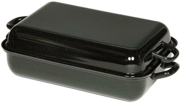 Riess Bratpfanne mit Deckel, rechteckig in schwarz aus Emaille. In 2 verschiedenen Größen erhältlich. Zum Braten und Backen geeignet.