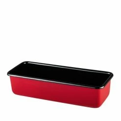 Riess Kuchenform aus Emaille in rot/schwarz. Die längliche Backform mit Bördelrand ist ideal für Brot, Kuchen, Pasteten und Parfait. Die Tortenform ist 30 cm lang und 10 cm breit. Emaille ist besonders langlebig und mit porenloser Oberfläche besonders glatt.