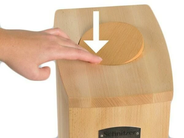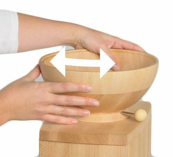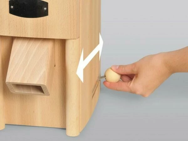 Der leichtgängige Einstellhebel ermöglicht eine stufenlose Bestimmung des Feinheitsgrades. Auf feiner Einstellung mahlt die Schnitzer Vario ca. 110 g Feinmehl je Minute, bei grober Einstellung ca. 300 g Schrot.