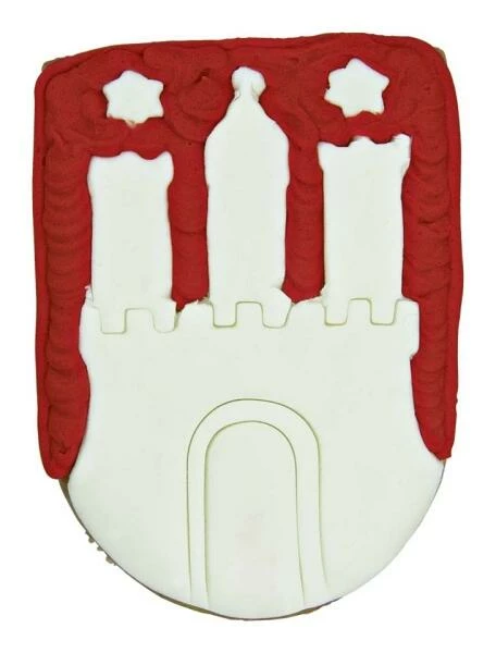 Der Präge-Ausstecher formt das Hamburger Wappen mit Burg, Mariensternen und Stadttor. Sie müssen es nach dem Ausstechen nur noch backen und bemalen.