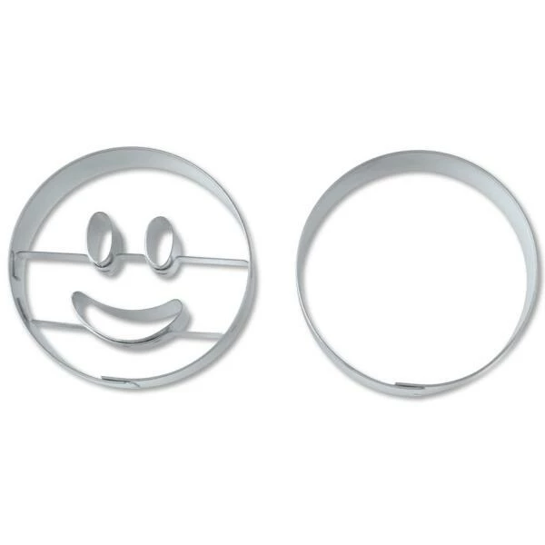 Im Set finden Sie einen Kreis-Ausstecher mit geprägtem fröhlichen Lachen und einen Konturen-Ausstecher.
