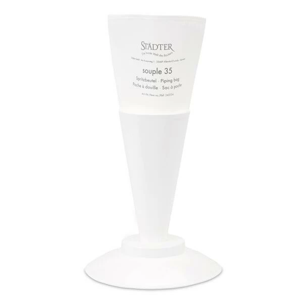 Bei vielen Arbeitsgängen und mehreren Tätigkeiten zur gleichen Zeit kann es beim Backen und Dekorieren schon mal unhandlich und kompliziert werden. Der Absetzständer soll Ihnen die Handhabung der Spritzbeutel vereinfachen. Er erleichtert das Einfülle n und Trocknen der Beutel und kann zum Absetzen zwischen den Spritzvorgängen benutzt werden.