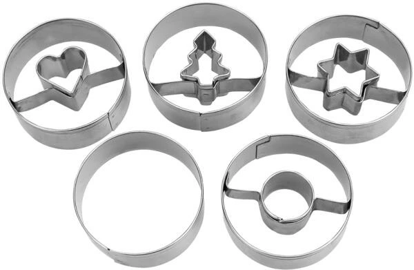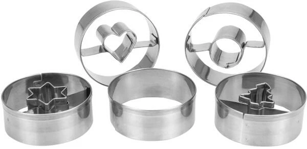 Set mit den Motiven Ring, Herz, Stern und Tanne für feine Spitzbuben. Zum Ausstechen von Teig, Fondant, Marzipan, Obst oder Gemüse. Auch geeignet zum Basteln oder Modellieren mit bspw. Knetmasse, Salzteig oder Fimo.