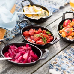 Staub Fischplatte kann auf dem Herd wie im Ofen für die unterschiedlichsten Zubereitungsarten eingesetzt werden. Der gusseiserne Topf zeichnet sich durch seine ovale Form aus, so dass ein ganzer Fisch, wie zum Beispiel eine Forelle, eine kleine Dorade oder auch ein paar Rotbarben, dort mühelos Platz finden. Ein Vorteil von Töpfen aus Gusseisen ist die hohe Wärmeleitfähigkeit. Die Hitze wird dadurch im ganzen Topf gleichmäßig verteilt, der Fisch gart so im Fischtopf wie in einem kleinen Ofen von allen Seiten.