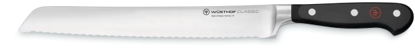 Brotmesser von Wüsthof aus der Serie Classic mit Doppelwelle. Der Wellenschliff der Klinge wird mit jeder Kruste fertig. Egal, ob hartes oder weiches Brot, knusprige Braten, die Schwarte vom Speck, Brötchen, Kohl, Salatköpfe und Torten/Kuchen.