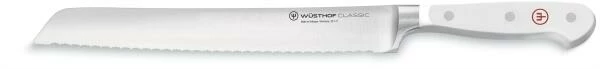 Wüsthof Brotmesser aus der Serie Classic White mit Doppelwelle. Der Wellenschliff der Klinge wird mit jeder Kruste fertig. Egal, ob hartes oder weiches Brot, knusprige Braten, die Schwarte vom Speck, Brötchen, Kohl, Salatköpfe und Torten/Kuchen.