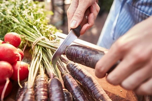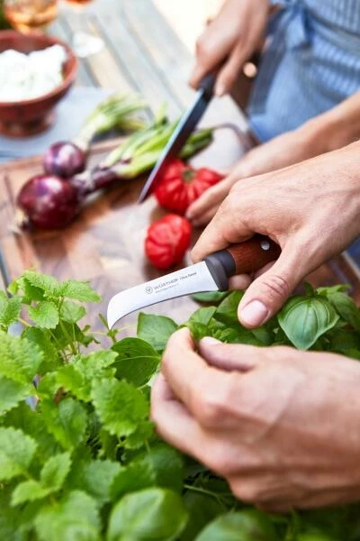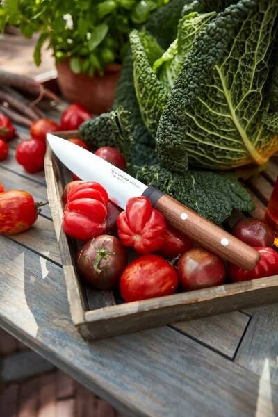 Der Griff aus nachhaltig angebauter und thermisch behandelter Buche ist extrem widerstandsfähig und Wasser abweisend. Kombiniert mit dem rutschfesten Kropf gibt er einen sicheren Halt. Alle Messer sind gut ausbalancierte, komfortable und effiziente Werkzeuge, die sich ideal für Gemüse und Fleisch eignen oder wie das einzigartige Erntemesser zum Pflücken von Gemüse, Früchten oder Kräutern im eigenen Garten.