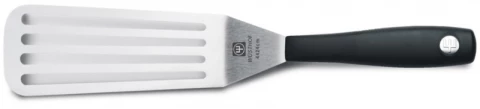 Palette Silverpoint mit Schlitzen, 12 cm. Durch die abgewinkelte Form eignet sich die Palette zum Abheben fast aller Gerichte, die in der Pfanne oder auf dem Backblech zubereitet werden. Die langen Schlitze lassen Fett und andere Flüssigkeiten leicht abtropfen.